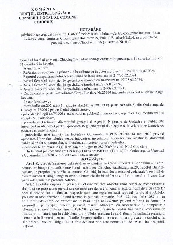 HOTĂRÂRE privind înscrierea definitivă în Cartea funciară a imobilului – Centru comunitar integrat situat în intravilanul comunei Chiochiș, sat Bozieș, nr. 29, județul Bistrița-Năsăud, în proprietatea publică a comunei Chiochiș, județul Bistrița-Năsăud